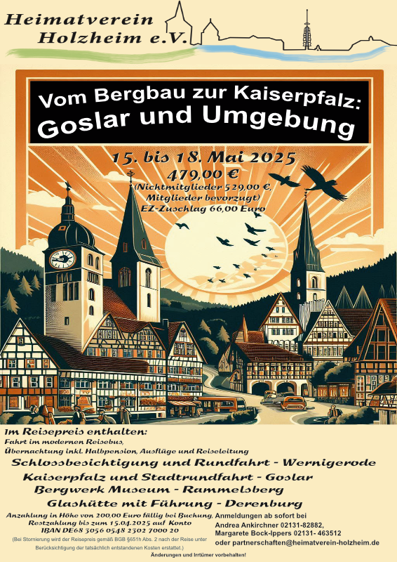Mehrtagesausflug Goslar + zum Google Calendar hinzufügen + zu iCal exportieren Datum 15.05.2025 - 18.05.2025 Uhrzeit Den ganzen Tag Kategorie Arbeitsgruppe Heimatverein Archiv Archiv Monat auswählen September 2025 Mai 2025 Februar 2025 Dezember 2024 Oktober 2024 Mai 2024 April 2024 März 2024 Februar 2024 Dezember 2023 November 2023 August 2023 Mai 2023 November 2022 Januar 2022 Januar 2021 Januar 2020 September 2019 August 2019 April 2019 Juni 2018 März 2018 Januar 2018 Dezember 2017 Januar 2017 November 2015 August 2015 April 2012 März 2012 KategorienKategorien Kategorie auswählen Aktuelles / Archiv Archäologie Fahrradgruppe Holzheim Partnerschaften Startseite Theater